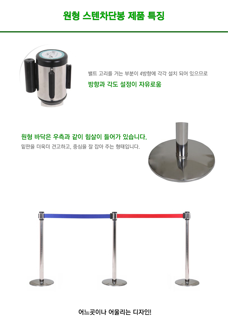 1. 출입구를 안내하거나 전시물 행사를 통제 할 때 가이드 라인으로 많이 사용되는 제품입니다.2. 스테인레스로 제작되어 튼튼하며 비를 맞아도 잘 녹슬지 않는 장점이 있습니다.3. 벨트 색상은 옵션에서 선택이 가능합니다.4. 밑판에 힘살을 주어 충격을 흡수하여 무게를 주어도 형태가 훼손되지 않습니다.
