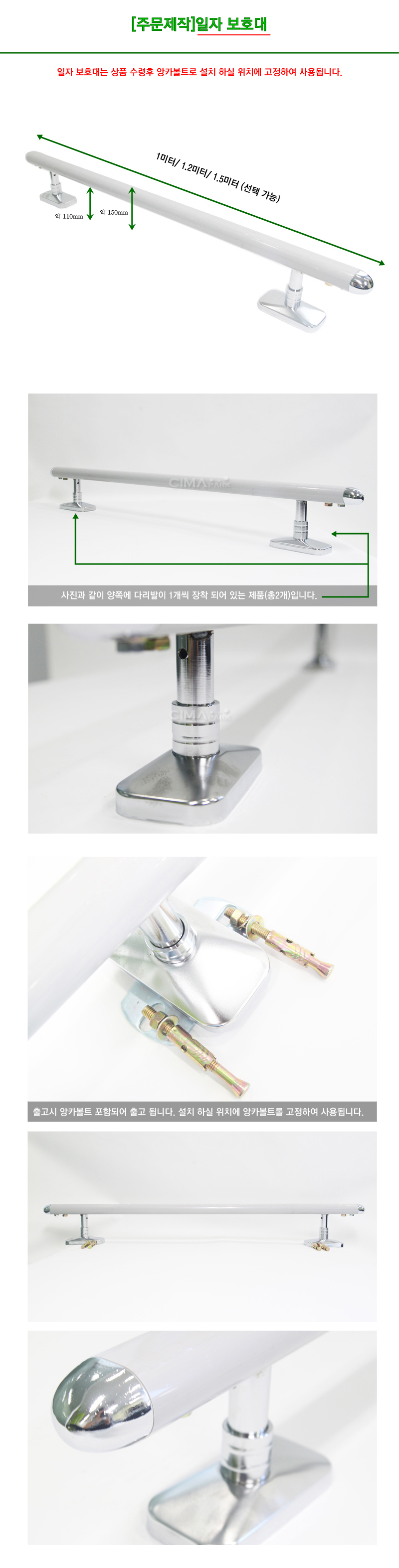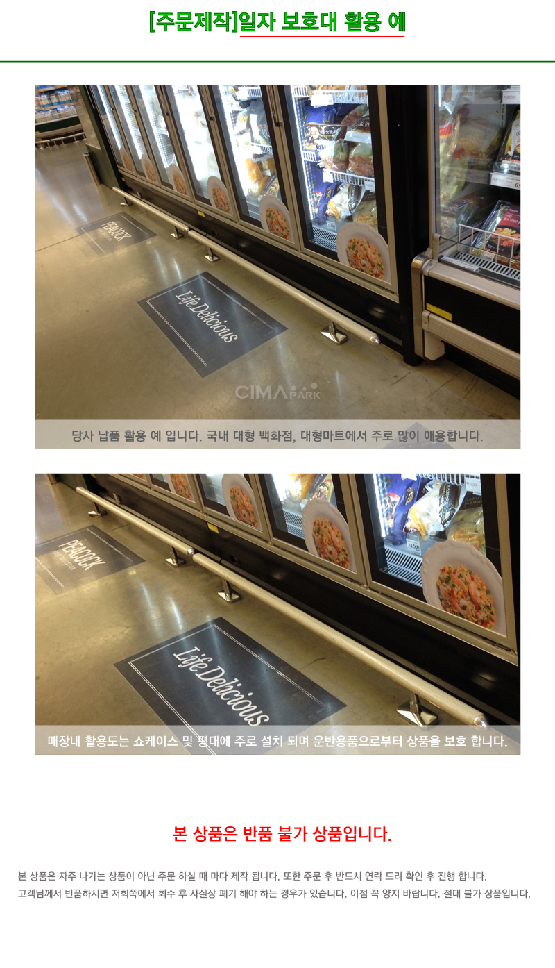 주문포인트 | 1. 백화점 대형매장에서 많이 사용되는 보호대입니다. 2. 매장내 쇼케이스, 평대등에 위치하며 운반카트류로 부터 상품을 보호 할 수 있습니다. 3. 출고시에는 앙카볼트까지 같이 제공됩니다. 4. 앙카볼트를 이용하여 설치한 곳에 고정하여 사용합니다. 5. ?본 상품은 자주 나가는 상품이 아닌 주문 하실 때 마다 제작 됩니다. 또한 주문 후 반드시 연락 드려 확인 후 진행 합니다. 이러한 이유는 본 상품은 반품 및 취소가 절대 불가한 상품입니다. 고객님께서 반품하시면 저희쪽에서 회수 후 사실상 폐기 해야 하는 경우가 있습니다. 이점 꼭 양지 바랍니다. 절대 불가 상품입니다.