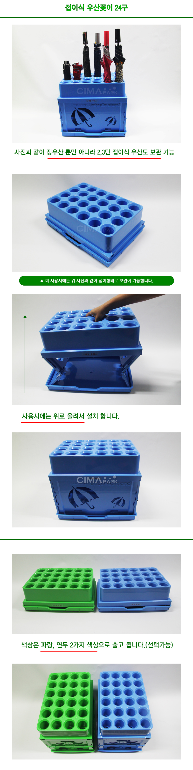 1. 접이식 형태로 사용하지 않을 때에는 접어서 보관리 가능한 상품입니다.2. 장우산은 물론 2단, 3단 접이식 우산 보관도 용이한 상품입니다.3. 총 24개 우산 보관이 가능하며 색상은 파랑과 연두 2가지 색상에서 선택 해 주시면 됩니다.4. 운임은 무료이나 타제품과 묶음 무료 출고는 되지 않습니다.