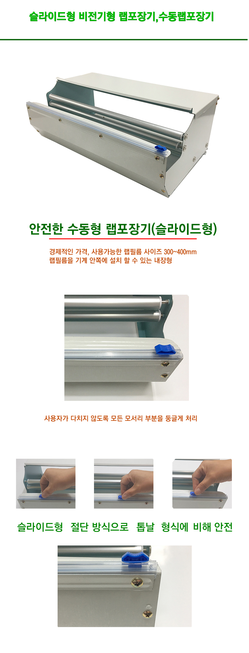 - 슬라이드형 절단방식으로 톱날형식에 비해 안전합니다. - 사용자가 다치지 않도록 모서리 부분을 둥글게 처리 하였습니다. - 사용 가능한 랩필름 사이즈 300~400mm 입니다. - 랩필름을 기계 안쪽에 설치할 수 있는 내장형 입니다. - 랩은 판매되지 않습니다. |