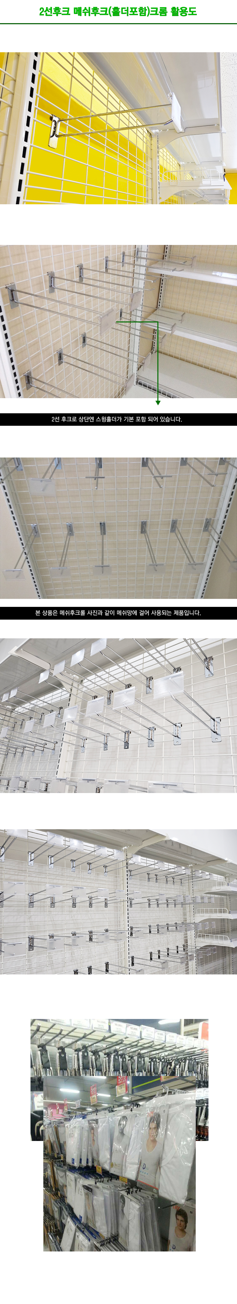 1. 휀스망이나 진열대 후면이 메쉬인 곳에 걸어 사용되는 후크입니다.2. 2선후크로 상단 스윙홀더 장착으로 인쇄물을 넣어 노출 가능합니다.3. 메쉬에 걸어 사용되는 제품으로 바용, 월용으로는 맞지 않습니다.