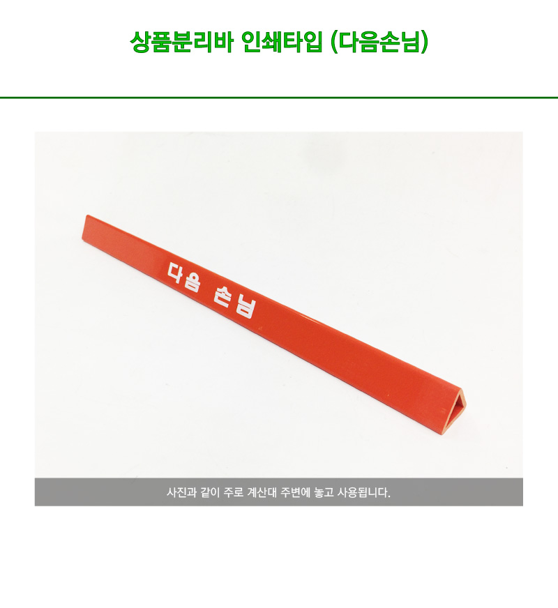 1. 주로 계산대 주변에 놓고 활용됩니다.2. 주 사용 용도는 고객의 상품을 구분하기 위해 사용됩니다.3. 길이는 100% 일치 하지 않으나 약 457선 정도에서 재단되어 출고되는 상품입니다.4. 인쇄타입으로 중앙 부분에 다음손님 인쇄되어 있습니다.
