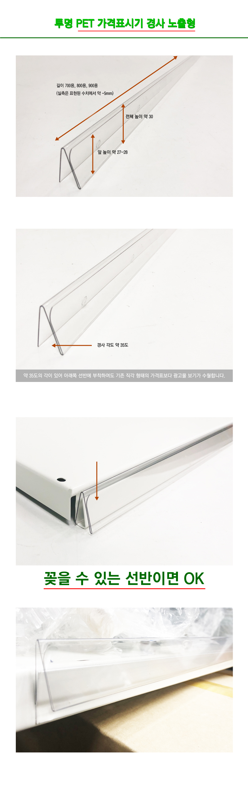 1. 본 제품은 쇼케이스, 진열대에 꽂아 사용하는 가격표입니다.2. 따라서 설치 하시고자 하는 곳이 끼울 수 있는 홈이 길게 있어야 가능합니다.3. POP물(가격표, 상품명등)은 높이 30mm이내가 적합 하며 그 이상은 노출형태로 노출 됩니다. 4. 친환경 소재로 화재시 유해물질이 발생되지 않아 친환경 매장에 많이 이용되고 있습니다.