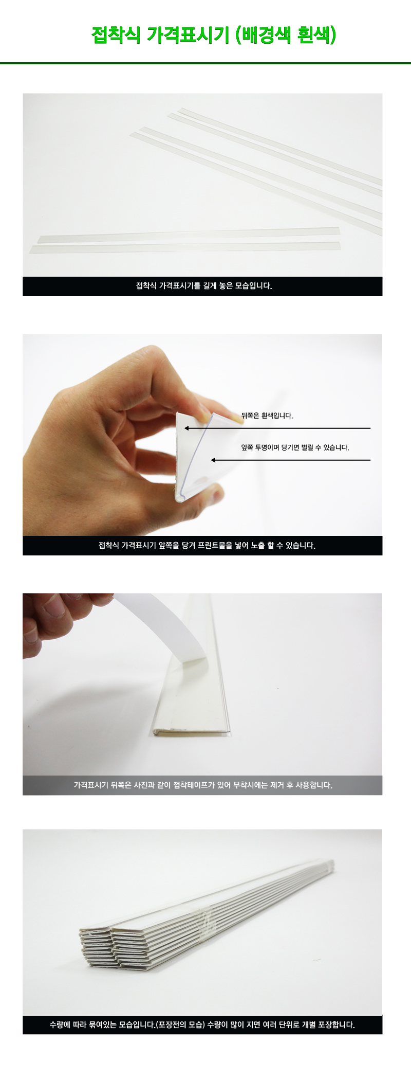 1. 앞쪽은 투명으로 인쇄물(상품명, 가격등)을 끼워 노출 하실 수 있습니다. 2. 뒷면은 흰색, 검정중 선택 주문 가능하며 양면 테이프가 부착 되어 있습니다. 3. 본 상품은 부착형 이기 때문에 진열대, 쇼케이스등 부착면이 있는 곳에 활용됩니다. 4. 검정 색상은 길이 1800 에 대해서는 많은 재고를 보유하지 않으니 급하시면 문의 후 주문 해 주세요.